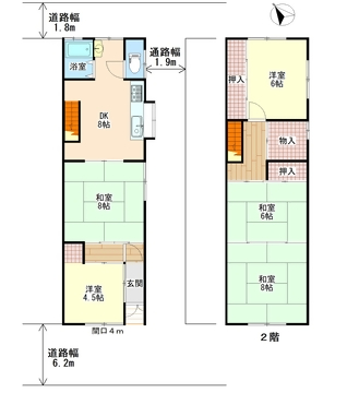建物は延床面積約93㎡の木造2階建てで、建物の間口が4mに絞られ、奥に向かって直線的に部屋が連なる「町家」の構成が最大の特徴です。この奥へ奥へと進むレイアウトは、通りに面した手前の部屋を趣味のアトリエや土間として街に開き、奥のDKや2階の居室を静かなプライベート空間にするなど、公私の動線を明確に分けるプランに活かせます。また、南側と北側の両面が道路に面しているため、細長い建物でありながら風通しの計画を立てやすい点もメリットです。